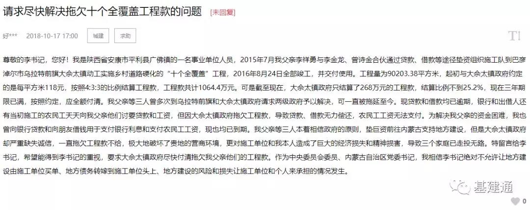 一名在內蒙古支援建設的網友發帖求助,2015年網友承接了鄉村道路硬化工程,工程款共計1064.4萬元。2018年工程竣工并交付使用后,政府只結算了268萬元。網友在留言中表示,“政府拖欠工程款,導致貸款、借款無力償還,農民工工資無法支付。”