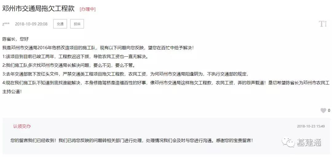 河南網友在2016年與政府簽定了危橋改造項目,工程款卻遲遲不下撥,導致農民工工資也一直沒有解決。