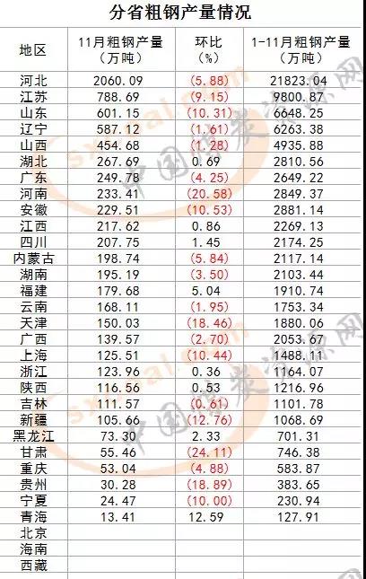 國(guó)家統(tǒng)計(jì)局近日公布了2018年11月份全國(guó)規(guī)模以上工業(yè)分省粗鋼產(chǎn)量,數(shù)據(jù)顯示,11月份,單月粗鋼產(chǎn)量500萬(wàn)噸以上的冀蘇魯遼4省,合計(jì)生產(chǎn)粗鋼4037.1萬(wàn)噸,占全國(guó)總產(chǎn)量的52.0%。統(tǒng)計(jì)的31個(gè)省區(qū)中,有20個(gè)省區(qū)粗鋼產(chǎn)量環(huán)比下降,其中14個(gè)省區(qū)降幅大于全國(guó)6.0%的平均水平。